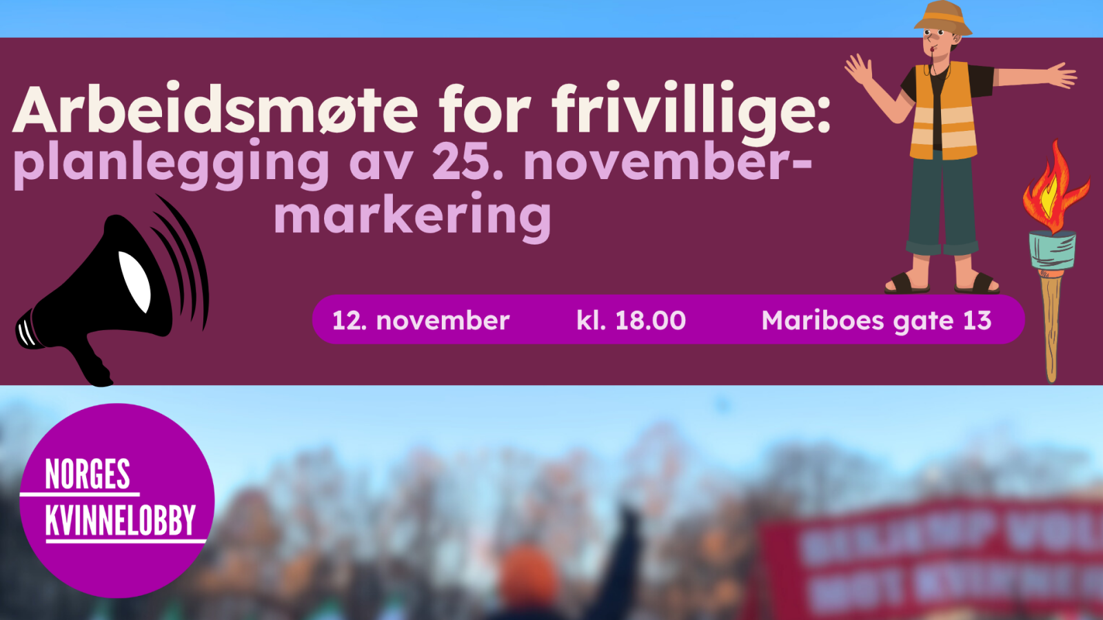 Vi inviterer alle som har meldt seg som frivillige til 25. november-markeringen til et arbeidsmøte for å planlegge og fordele oppgaver under markeringen. Det blir lett servering!
