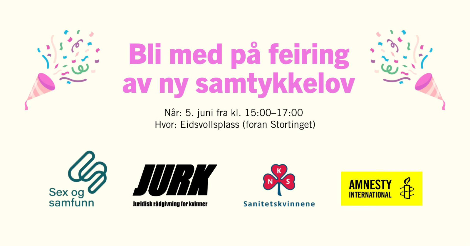 Dette er en seier vi har kjempet for sammen – og nå er det på tide å feire den. Sammen med Samtykkealliansen og Amnesty International Norge inviterer vi deg som har heiet, jobbet, stått på, delt historier, mobilisert og aldri gitt opp.