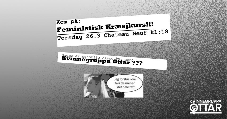 Ikke bli sittende og lure på hva vi mener eller hva vi gjør, kom og snakk med oss! Kom på kræsjkurs og lær mer om feminisme og Ottar. Del dine erfaringer, tanker og bekymringer og spis gratis pizza! Vi ses på Chateau neuf i Oslo