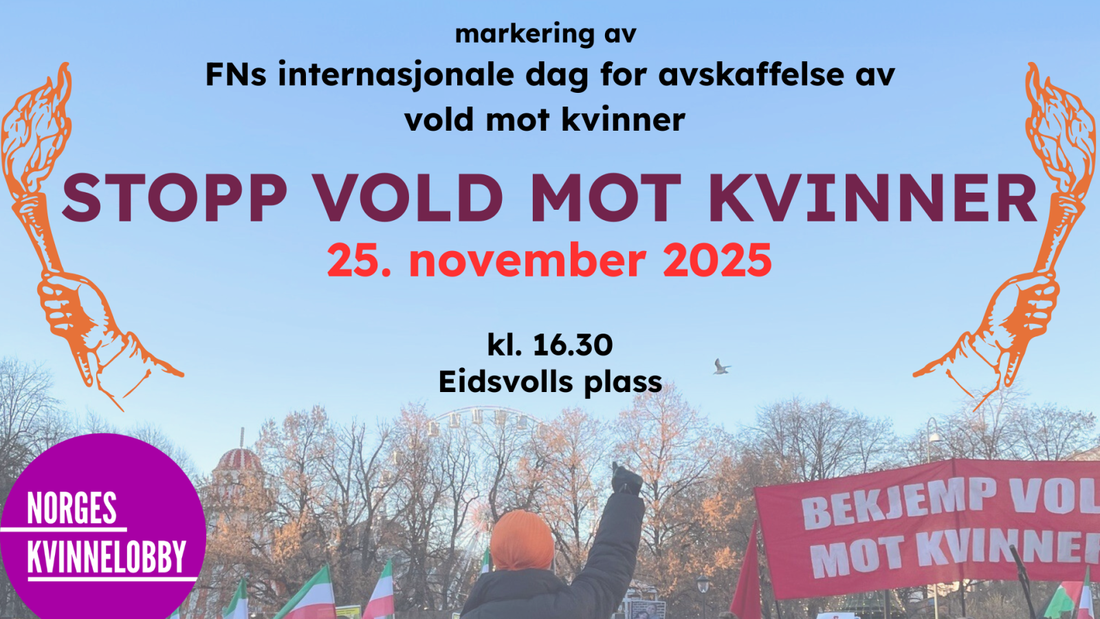 Vi inviterer til markering med appeller, musikalske innslag fra Kvindelige Studenters Sangforening, samt tenning av fakler for å vise støtte og solidaritet til kvinner som utsettes for vold, og for å minnes kvinner som har blitt drept i 2025