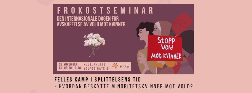 I anledning den internasjonale dagen for avskaffelse av vold mot kvinner inviterer MiRA-Senteret derfor til frokostseminar for å diskutere hvordan vi kan styrke arbeidet mot kjønnsbasert vold og diskriminering for å sikre trygghet og reell likestilling.
