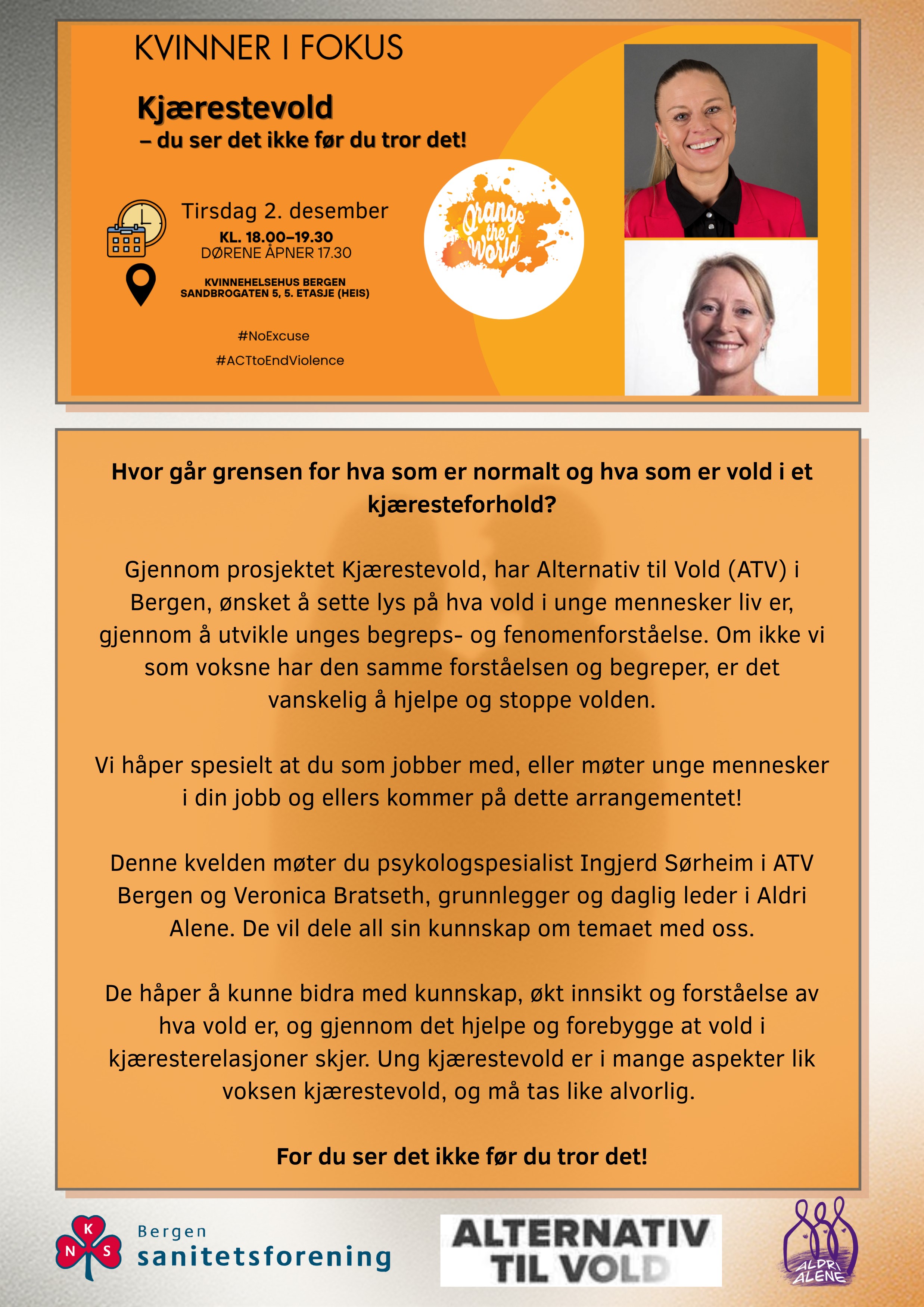 Velkommen til Kvinner i fokus tirsdag 2. desember. Tema denne kvelden er «Kjærestevold – du ser det ikke før du tror det!» Hvor går grensen for hva som er normalt og hva som er vold i et kjæresteforhold?
