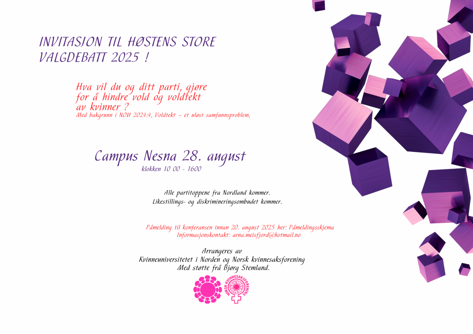Kvinneuniversitetet i Norden og Norsk Kvinnesaksforening inviterer til konferanse med faglige innlegg og politisk debatt om hva politikere i Nordland vil gjøre for å forebygge vold og voldtekt av kvinner.