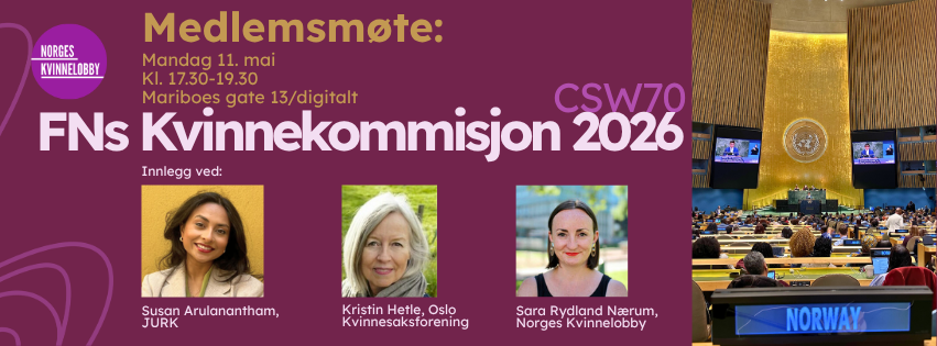 Norges Kvinnelobby inviterer til møte om FNs kvinnekommisjon 2026 (CSW70). Susan Arulanantham (JURK), Kristin Hetle (Oslo kvinnesaksforening) og Sara Rydland Nærum (NKL) skal fortelle om turen til New York og arbeidet med kommisjonen.